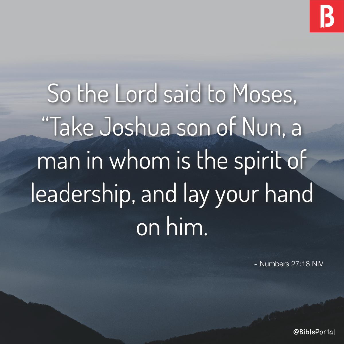摩西臨終之前,蒙神恩待,來到視野遼闊,足以一覽迦南美地的亞巴琳山上。摩西知道自己來日無多,因而求神恩待以色列人,能有一位如牧人般能夠引領百姓進入應許地的人賜給他們。神對摩西說:約書亞是心中有聖靈的人,你要帶他到會眾前,為他按手賦予使命,也要吩咐會眾聽從。約書亞也要站在大祭司以利亞撒面前,領受出於神的心意判斷,且照著神的話語帶領百姓出入的相信。於是,神怎麼吩咐,摩西就怎麼去做。